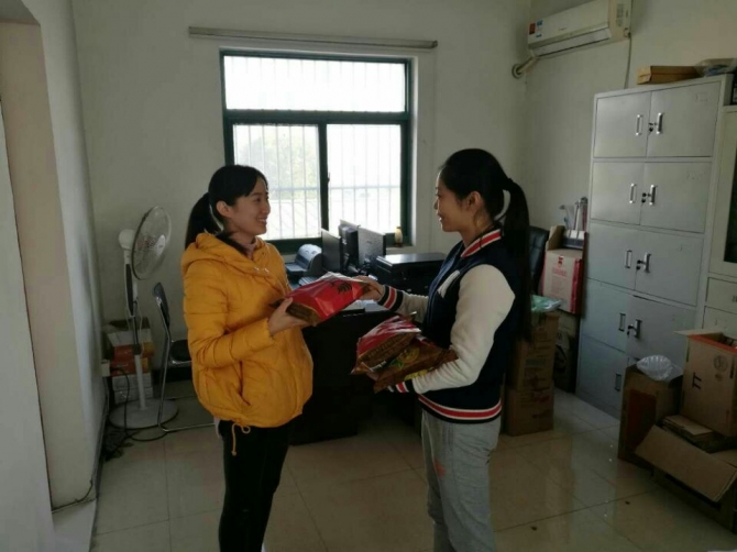 辦公室人員給財務(wù)部人員派發(fā)福利!