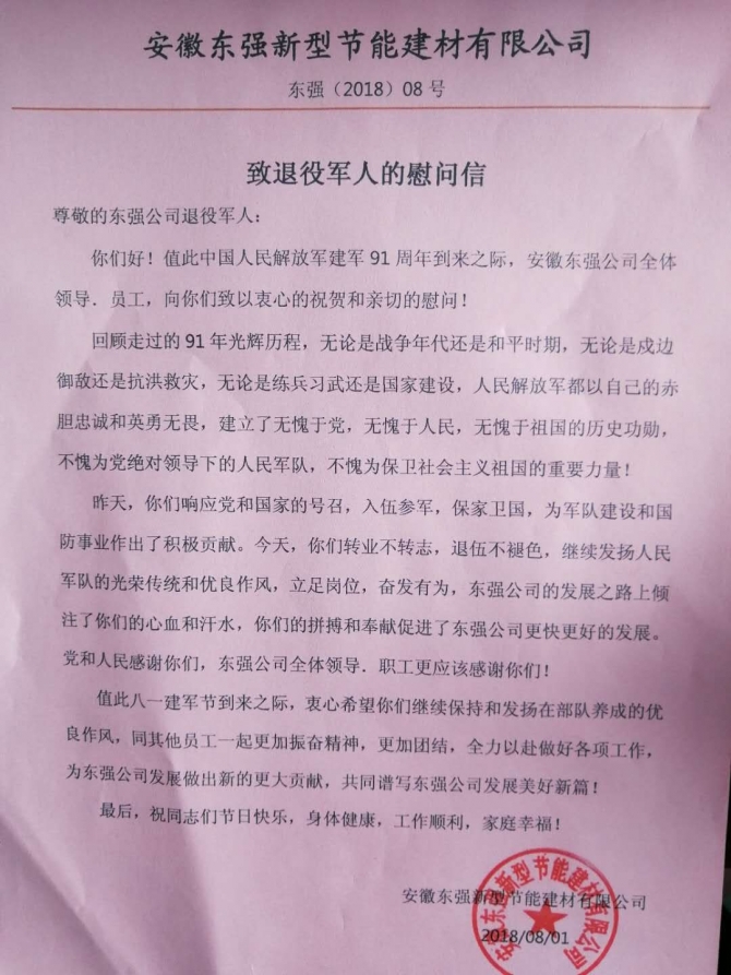 今天迎來(lái)中國(guó)人民解放軍建軍91周年,安徽東強(qiáng)公司全體領(lǐng)導(dǎo)、員工,向祖國(guó)最親愛(ài)的子弟兵致以衷心的祝福,同時(shí)向公司退伍軍人表達(dá)親切的慰問(wèn)。
